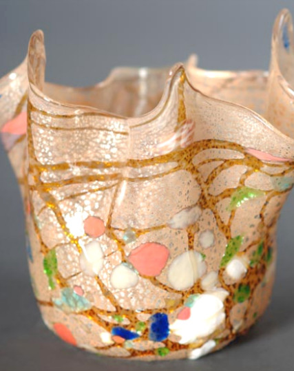 Ciotola de Fornase a forma di fazzoletto di vari colori a fantasia del Maestro e movimenti di vetro irregolari. La ciotola è realizzata rotolando soffiando a bocca il vetro incandescente dopo averlo mescolato a piccoli pezzi di vetro di colori diversi e in foglie d‘argento sottilissime, che fondendosi rendono la coppetta ricca di colori e fantasie.
