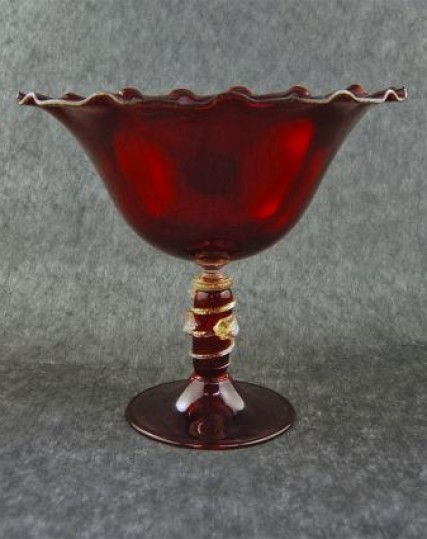 Coppa alzata in vetro rosso di Murano soffiata a bocca con piede a cono e coppa liscia ad orlo "smerlato" a pinza. Lo stelo della coppa è liscio e presenta una lavorazione a spirale con un filo di vetro avvolto quando è incandescente. Disponibile anche nelle varianti di colore: nero, azzurro, blu, ambra, cristallo-oro e cristallo.