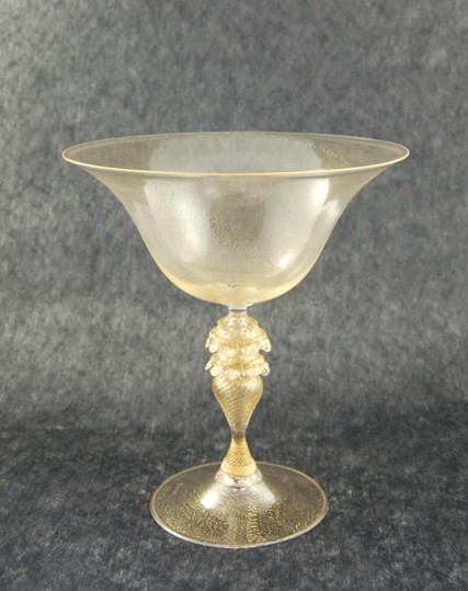 Coppa alzata tonda soffiata a bocca cristallo-oro. Il piede a cono e coppa a campana sono lisci. Lo stelo color cristallo-oro è a forma di goccia allungata decorato a pinza dal Maestro. Disponibile anche nelle varianti di colore per la coppa e il piede: nero, azzurro, blu, ambra, rosso e cristallo. Per lo stelo la variante colore è l‘ambra.