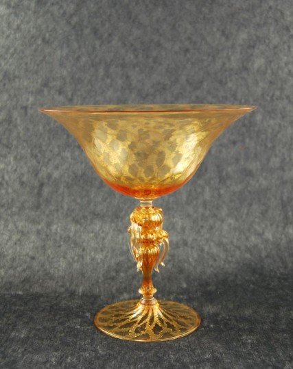 Coppa alzata tonda color ambra con lavorazione "retinata" soffiata a bocca con piede a disco e coppa liscia. Lo stelo a rocchetto è lavorato a "craquellè" e arricchito da festoni applicati a pinza. Disponibile anche nelle varianti di colore: nero, blu, cristallo-oro, rosso e cristallo.