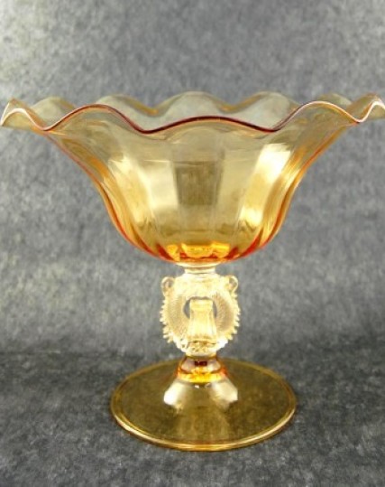 Coppa alzata tonda color ambra in vetro di Murano soffiato a bocca. Il piede e la coppa sono lisci, la corolla è smerlata a pinza e lo stelo decorativo è tondo color cristallo-oro. Disponibile anche nelle varianti di colore per la coppa e il piede: nero, azzurro, blu, rosso, cristallo-oro e cristallo. Per lo stelo la variante colore è l‘ambra.