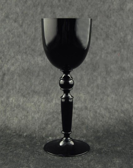 Creazione di eccezionale eleganza, questo calice in vetro di Murano è composto da una coppa classica molto sobria e uno stelo che fonde le forme cilindrica e sferica con l‘ausilio di elementi lineari orizzontali. Lo stile cerimoniale della forma unito alla classe data dal nero conferisce al calice una particolare solennità.