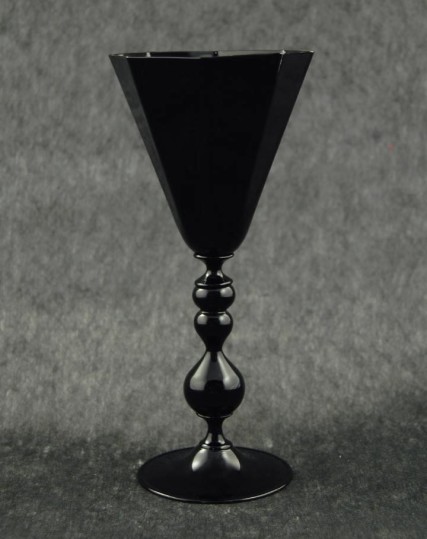 Realizzazione raffinata ed estrosa allo stesso tempo, questa forma composita è frutto della fantasia del Maestro vetraio. La soffiatura a bocca in uno stampo di legno ottagonale consente di ottenere oggetti come questo, che combinano una coppa geometrica e uno stelo sinuoso carico di movimento, generato dalla forma a goccia che viene a formarsi progressivamente dall‘alto al basso.