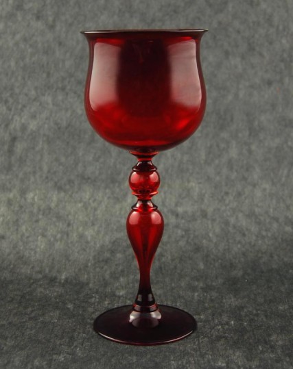 Realizzazione del Maestro in vetro soffiato di Murano che coniuga ricchezza e semplicità. Il rosso rubino colora tutta la superficie levigata di questo calice dalla forma non troppo elaborata. La composizione è fondata su un equilibrio di linee curve che partono dalla coppa dalla forma classica e si snodano lungo lo stelo formato da un elemento sferico e un‘asta a goccia.