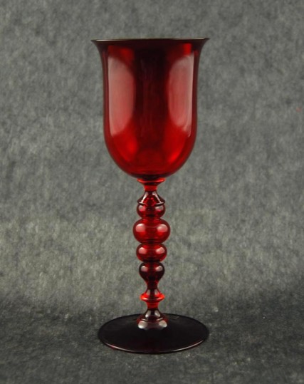 Questo calice è realizzato in vetro di Murano soffiato a bocca dal Maestro vetraio. Il colore rosso nelle sue varie sfumature, dal bordeaux scuro al rosso vivo, crea con i riflessi del vetro un gioco di luci seducente. Il calice perde la regolarità della forma cilindrica della coppa via via che scende verso la base, passando per una serie di sfere di diversa dimensione.