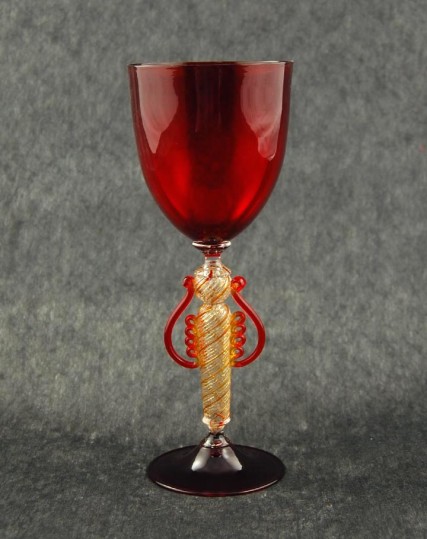 Realizzazione sfarzosa ma allo stesso tempo elegante e lineare, questo calice è un perfetto equilibrio di calore e semplicità. Il rosso acceso del vetro soffiato a bocca e la ricchezza degli intrecci dorati in cristallo sono compensati dalle geometrie essenziali dello stelo e della coppa, oltreché dalla finezza con cui sono state realizzate le avvolgenti striature in oro.