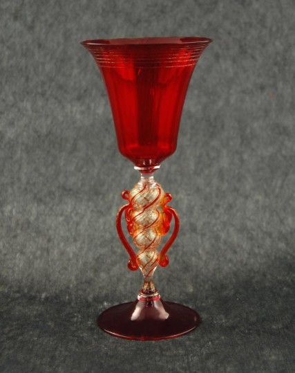 Questa creazione in vetro di Murano soffiato a caldo si compone di una parte rosso scarlatto costituita dalla coppa e dalla base e una parte in prevalenza dorata formata dallo stelo. La lavorazione a pinza crea il gioco sfarzoso di filature in vetro cristallo oro con striature rosse che culminano nei due raffinati baffi a riccio.