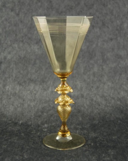 Calice che coniuga sfarzo a geometria. La coppa trasparente con tonalità ambrate è stata pensata dal Maestro con una forma ottagonale; il gioco di linee che la circonda nell‘estremità più larga contribuisce ad accentuarne la linearità. Lo stelo è invece una sontuosa lavorazione in cristallo dorato e applicazioni in foglia oro che rendono questo calice un oggetto di lusso.