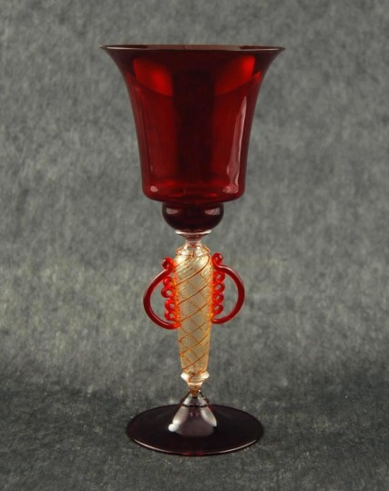Questa opera, frutto dell‘esperienza del Maestro vetraio, è un esempio di composizione bilanciata e armoniosa. Suggerisce una forma a triangolo, con un‘ipotetica base costituita dall‘orlo del vaso a campana rovesciata e il vertice superiore corrispondente all‘estremità dello stelo. Le striature dorate e i piccoli manici lavorati impreziosiscono il tutto.