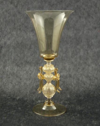 Pezzo unico creato dal maestro vetraio Fabiano Amadi, il calice unisce vetro di Murano trasparente soffiato a bocca e cristallo. Dalla forma composita, che ricorda un candelabro, il calice ha uno spiccato carattere decorativo. Uno stelo complesso, fatto di raccordi sferici rigati in cristallo uniti a elementi in vetro-oro finemente lavorati regge una lunga e sinuosa coppa dalla superficie liscia.
