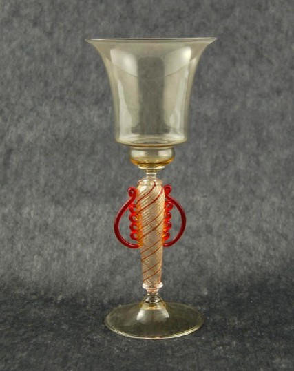 Pezzo unico realizzato dal maestro vetraio veneziano Fabiano Amadi in vetro di Murano soffiato a bocca. Dalla linea sobria data dal vetro trasparente, si compone di una base e una coppa a campana rovesciata tenute insieme da uno stelo in cristallo-oro lavorato. Lo stelo presenta striature rossastre e due piccoli manici attorcigliati rossi che conferiscono al calice una forma a trofeo.