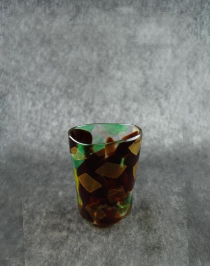 Set di 4 Goti de Fornase a base color cristallo pezzati in vetro di Murano soffiato a bocca. I bicchieri sono realizzati con applicazioni a caldo di pezzi di vetro di vari colori e sottili foglie d‘oro.