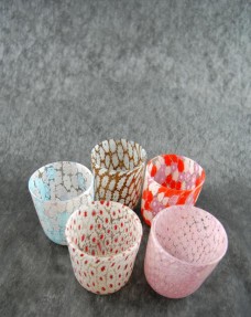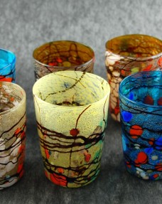 rnSet di 4 Goti de Fornase a base color cristallo pezzati in vetro di Murano soffiato a bocca. I bicchieri sono realizzati con applicazioni a caldo di pezzi di vetro di vari colori e s...
