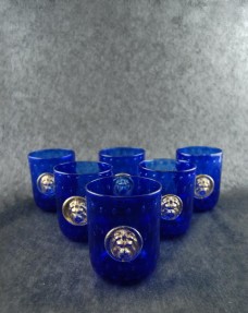 rnSet di 4 bicchieri cristallo in vetro di Murano color cristallo lavorato con pezze di vetro colorate e applicazione di sottilissime foglie d‘oro.