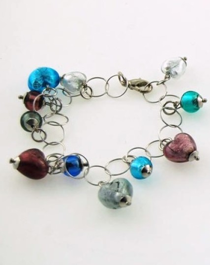 Bracciale in perle di vetro di Murano realizzate a mano con tecnica “a Lume”. La forma a cuore delle perle è abbinata a vari colori e dimensioni. La montatura degli anelli del bracciale è in argento italiano 925.