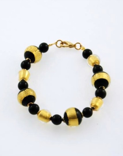 Bracciale in perle di vetro di Murano realizzate a mano con tecnica “a Lume” a foglia d‘oro. Il bracciale è composto di perle di due diverse dimensioni in vetro color nero e cristallo con anima in foglia d‘oro 24k all‘interno. La montatura del bracciale è in argento italiano 925 bagno oro.