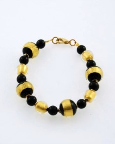 rnBracciale in perle di vetro di Murano realizzate a mano con tecnica “a Lume” a foglia d‘oro. Il bracciale è composto di perle di due diverse dimensioni in vetro color nero e cristall...