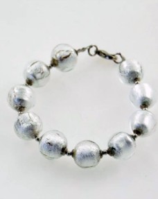 rnBracciale in perle di vetro di Murano realizzate a mano con tecnica “a Lume” a foglia d‘argento. Il bracciale è composto da 10 perle in vetro color cristallo con anima in foglia d‘ar...