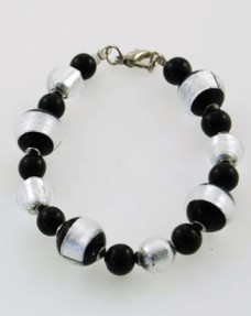 rnBracciale in perle di vetro di Murano realizzate a mano con tecnica “a Lume” a foglia d‘argento. Il bracciale è composto di perle di due diverse dimensioni in vetro color nero e cris...