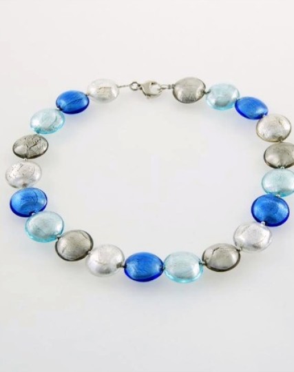 Collana in perle di vetro di Murano realizzate a mano con tecnica “a Lume” a foglia d‘argento. Le perle dalla forma tonda e schiacciata hanno tonalità cristallo, acquamarina chiaro, bluino e grigio. Ogni perla è lavorata finemente con una sottile foglia d‘argento 925 al suo interno.