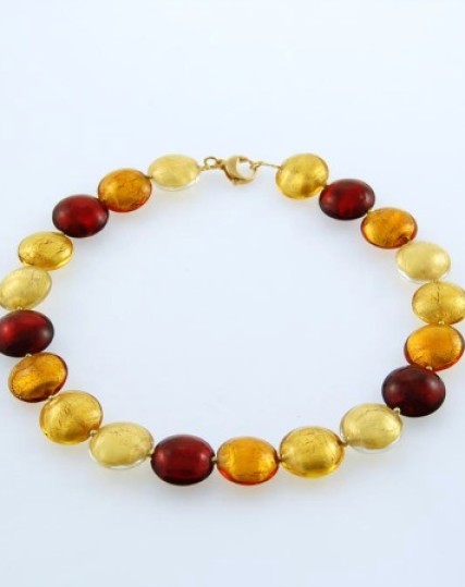 Collana in perle di vetro di Murano realizzate a mano con tecnica “a Lume” a foglia d‘oro. Le perle dalla forma tonda e schiacciata hanno tonalità cristallo, topazio chiaro e scuro, gaggia. Ogni perla è lavorata finemente con una sottile foglia d‘oro 24k al suo interno.