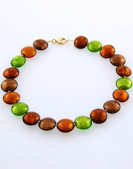 Collana in perle di vetro di Murano realizzate a mano con tecnica “a Lume” a foglia d‘oro. Le perle dalla forma tonda e schiacciata hanno tonalità topazio chiaro e scuro, verde erba scuro e ametista scuro. Ogni perla è lavorata finemente con una sottile foglia d‘oro 24k al suo interno.