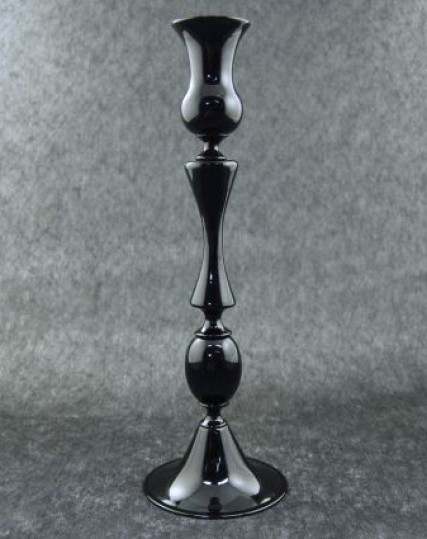 Candelabro nero a quattro elementi soffiato a bocca a vetro liscio con piede a cono. Lo stelo è composto da un globo ovale sormontato da un lungo balaustro. Disponibile nelle varianti di colore: rosso, blu, azzurro, cristallo e ambra. Ogni pezzo è unico ed è firmato dal maestro vetraio Fabiano Amadi.