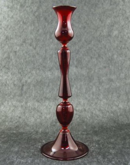 Candelabro rosso a quattro elementi soffiato a bocca a vetro liscio con piede a cono. Lo stelo è composto da un globo ovale sormontato da un lungo balaustro. Disponibile nelle varianti di colore: nero, blu, azzurro, cristallo e ambra. Ogni pezzo è unico ed è firmato dal maestro vetraio Fabiano Amadi.