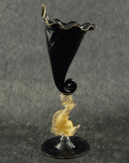 Cornucopia lavorata dal Maestro vetraio Fabiano Amadi con la tecnica detta a "Ballotton". Quest‘opera unica, realizzata in vetro di Murano soffiato a bocca, si compone di una coppa e una base lucide di color nero con striature dorate e uno stelo cristallo-oro. Lo stelo richiama un delfino in posa plastica che sostiene la grande conchiglia rappresentata dalla coppa. Lo stile marino risulta ancora più evidente nella variante di colore blu.