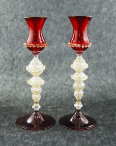 rnSet di 2 candelabri gemelli con coppa e piede color rosso. Il calice è decorato con filo di vetro lavorato a pinza. Lo stelo è composto da 4 globi tondi finemente decorati color cris...