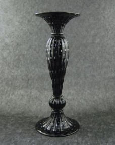 rnCandelabro gigante color nero soffiato a bocca a vetro rigato con piede a cono e coppa lavorati, stelo a balaustro allungato a goccia che sormonta un grosso globo schacciato. Disponi...