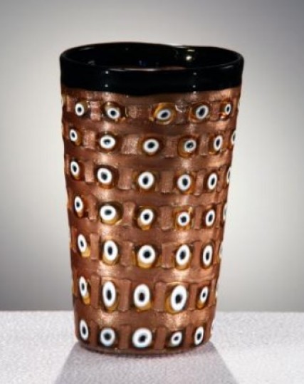 Elegante vaso in vetro di Murano soffiato a mano, realizzato attraverso la particolare lavorazione chiamata avventurina, che prevede l‘immersione in una pasta traslucida pagliuzze o cristalli di rame con ossidi metallici brillanti, arricchito dall‘inserzione di preziose murrine, che creano un suggestivo contrasto cromatico.
