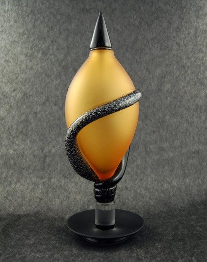 Vaso color cristallo-oro chiuso dalla forma a goccia allungata in vetro soffiato di Murano. Il vaso è chiuso con un tappo nero. L‘opera assume toni opachi per la particolare lavorazione sabbiata. Poggia su gambo trasparente e base nera. Le decorazioni vitree edese al corpo del vaso sono applicate a caldo. Disponibile anche nella variante di colore nera con tappo ambra.