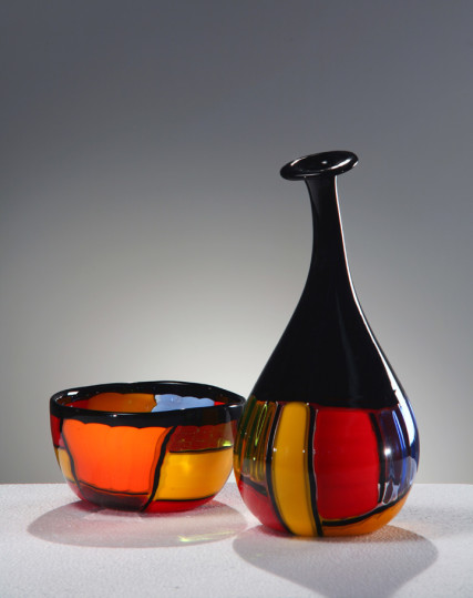 Elegante Vaso e coppa della serie Mondrian in vetro di Murano, interamente ralizzati a mano e soffiati a bocca, caratterizzati da un particolare accostamento cromatico che richiama chiaramente le opere del grande maestro olandese e che, giocando con la luce, donano suggestioni e riflessi unici.