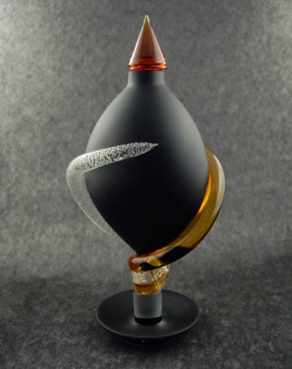 Vaso color nero chiuso dalla forma a goccia allungata in vetro soffiato di Murano. Il vaso è chiuso con un tappo ambra. L‘opera assume toni opachi per la particolare lavorazione sabbiata. Poggia su gambo trasparente e base nera. Le decorazioni vitree edese al corpo del vaso sono applicate a caldo. Disponibile anche nella variante di colore cristallo-oro con tappo nero.