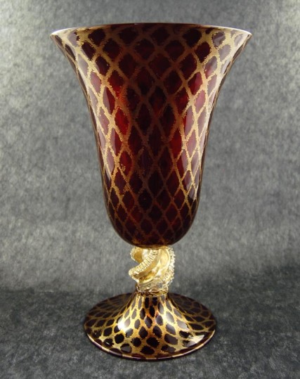Vaso rosso soffiato a bocca a lavorazione "retinata", piede a cono e coppa a campana svasata con lavorazione Lo stelo color cristallo-oro è costituito da diversi elementi spiraleggianti. Disponibile anche nelle varianti di colore per la coppa e il piede: nero, azzurro, blu, ambra, cristallo-oro e cristallo. Per lo stelo la variante colore è l‘ambra.