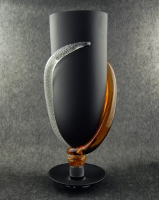 rnVaso a coppa ovale sabbiata color nero opaco su stelo trasparente e piede nero con fiamme di vetro a spirale color ambra e cristallo. Disponibile anche nelle varianti di colore con c...