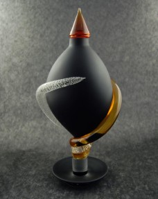 rnVaso color nero chiuso dalla forma a goccia allungata in vetro soffiato di Murano. Il vaso è chiuso con un tappo ambra. L‘opera assume toni opachi per la particolare lavorazione sabb...