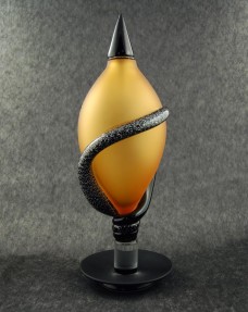 Vaso color cristallo-oro chiuso dalla forma a goccia allungata in vetro soffiato di Murano. Il vaso è chiuso con un tappo nero. L‘opera assume toni opachi per la particolare lavor...