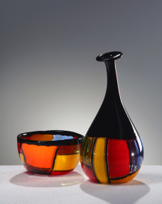 Elegante Vaso e coppa della serie Mondrian in vetro di Murano, interamente ralizzati a mano e soffiati a bocca, caratterizzati da un particolare accostamento cromatico che richiama ...