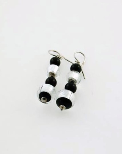 Handmade Murano glass beads earrings made using the silver-leaf “lamp” technique. Earrings are made of two different size beads in crystal and black colour glass with 925 silver-leaf core inside. The clasp is in 925 Italian silver.