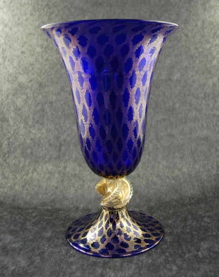 Open oval blue Murano glass crystal vase. The stem has been decorated by the Maestro with a great spiral globe. Vase’s body and foot are decorated with a fishnet pattern obtained by the hot application of a sheet of gold leaf to the molten glass.