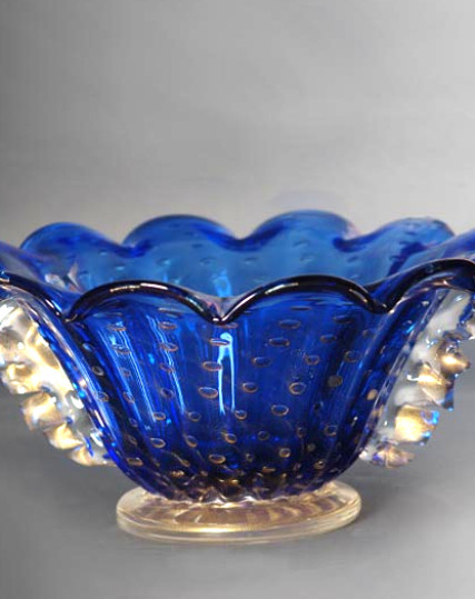 Coppa fruttiera blu in vetro soffiato a bocca con lavorazione "bolinata" e decorazioni dette "morise" color cristallo-oro e orlo "smerlato" a pinza. Disponibile anche nei colori: rosso, ambra, cristallo e cristallo-oro.